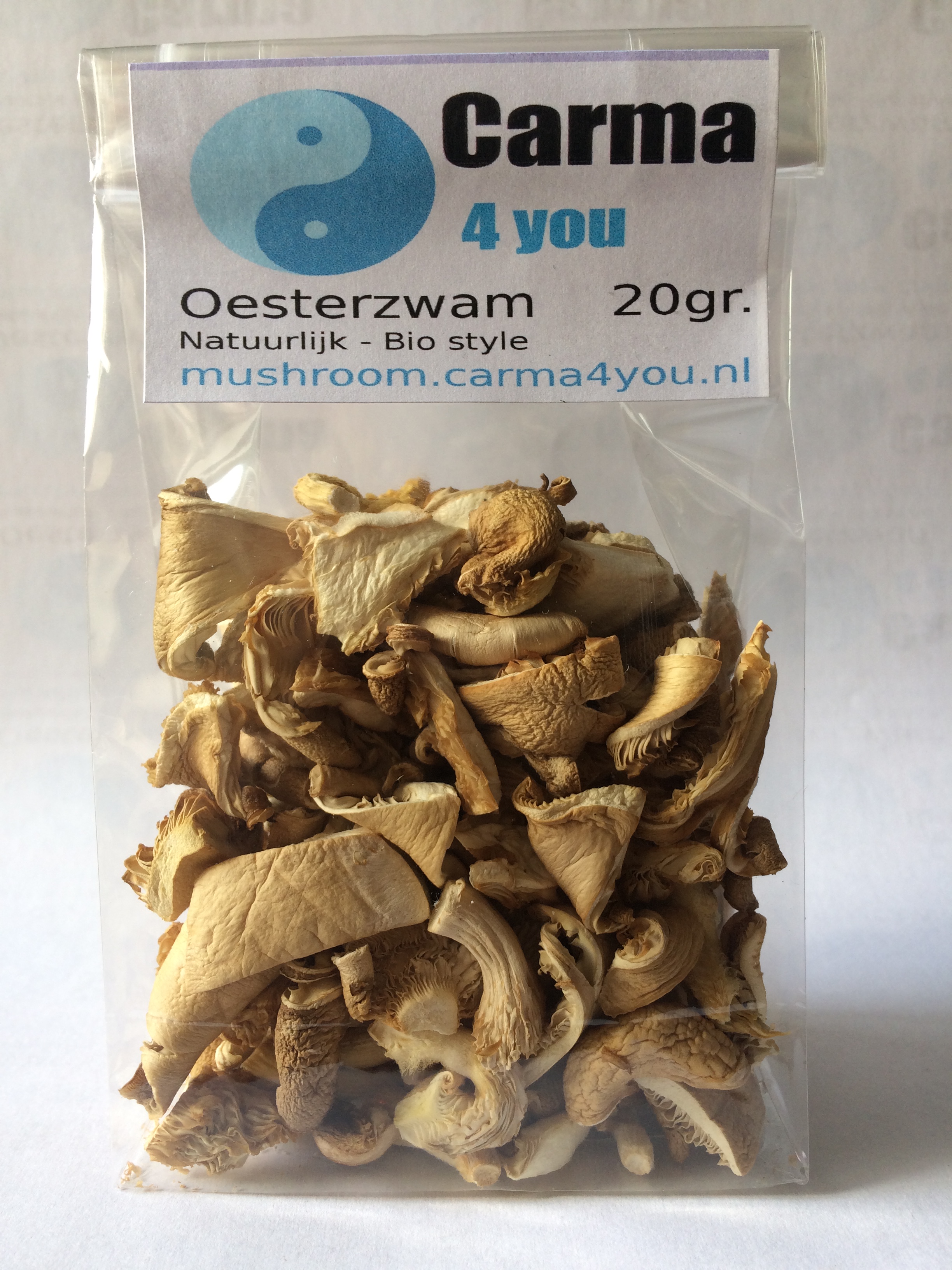 (23-5-18). Ons eerste zakje gedroogde Oesterzwammen. Alleen is "geel" in de printer op en is de kleur niet goed. Logo is blauw geworden.