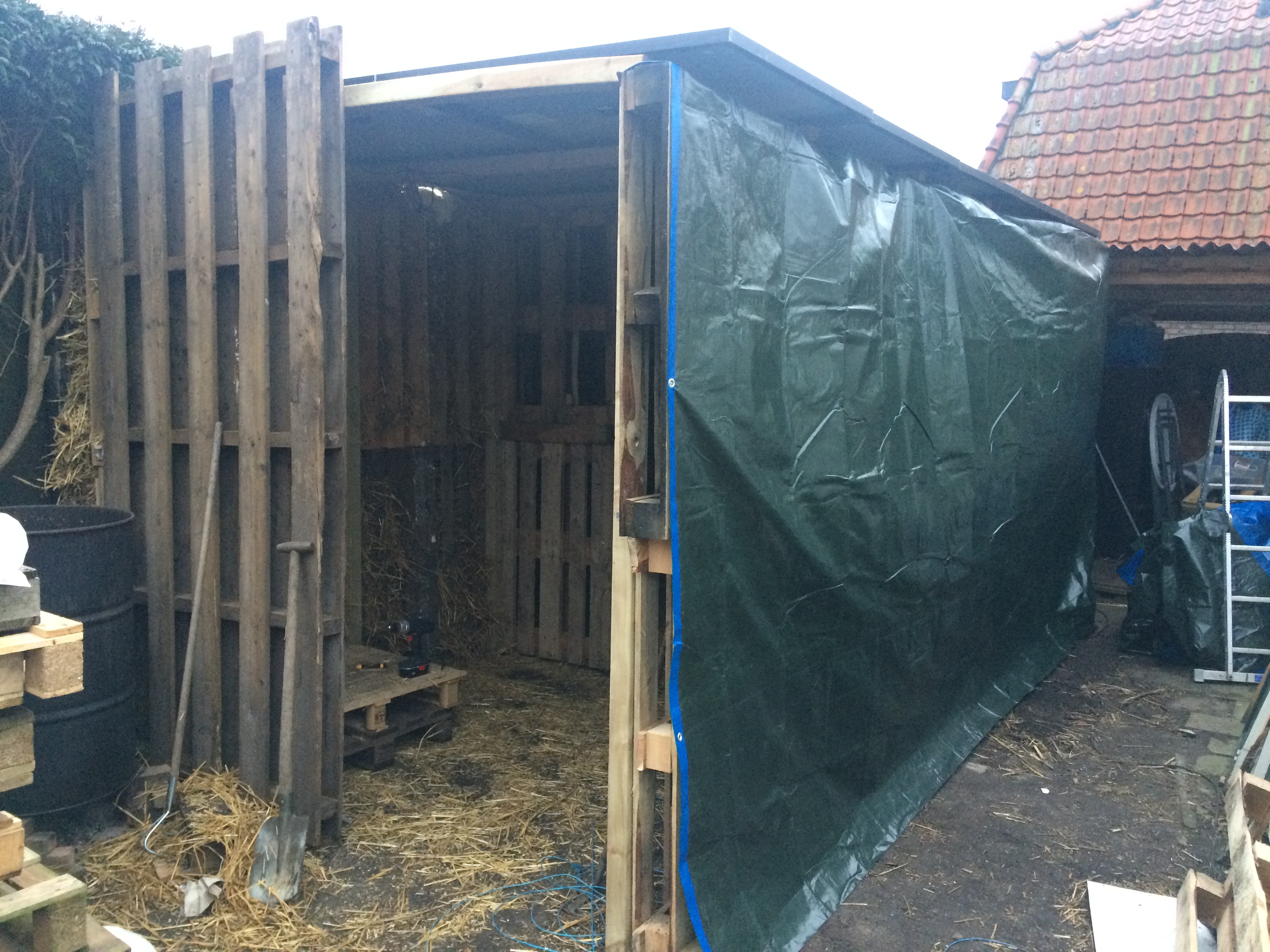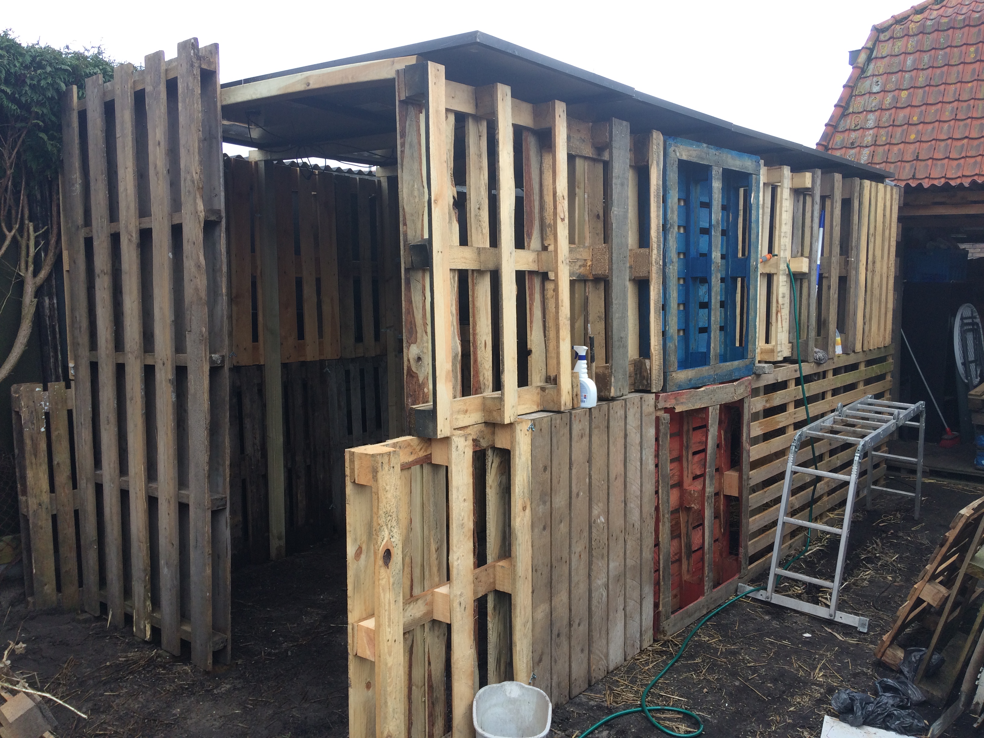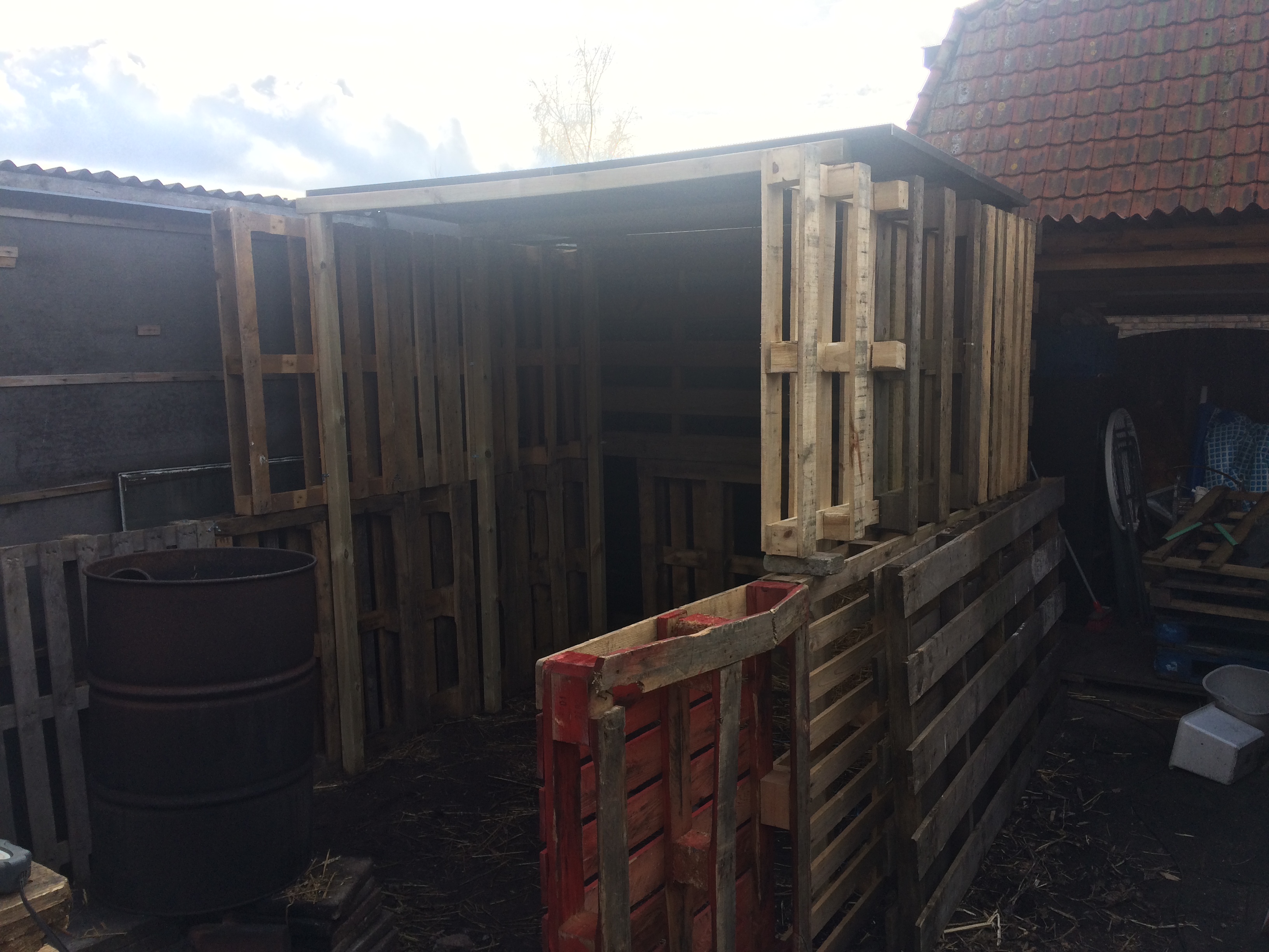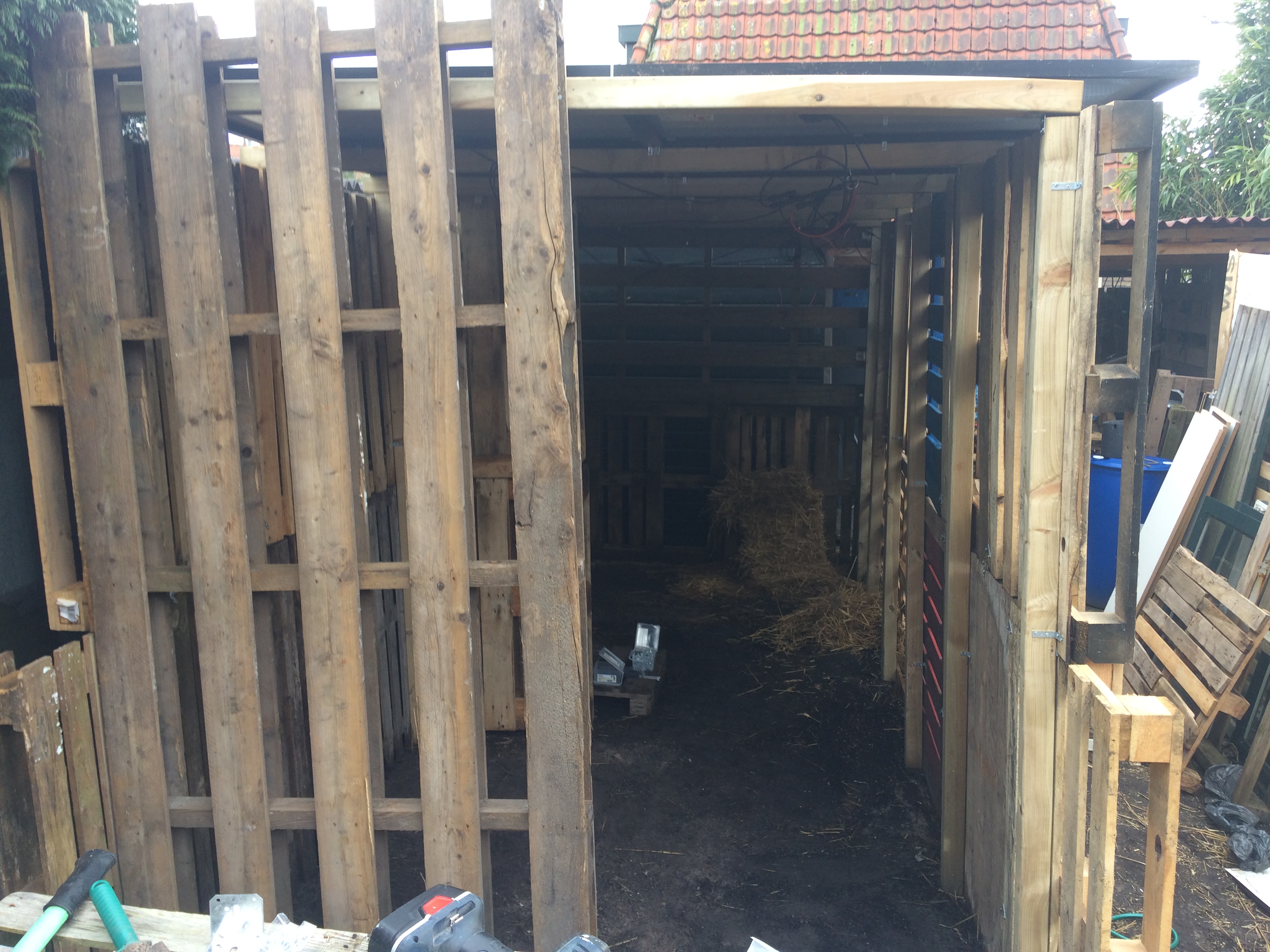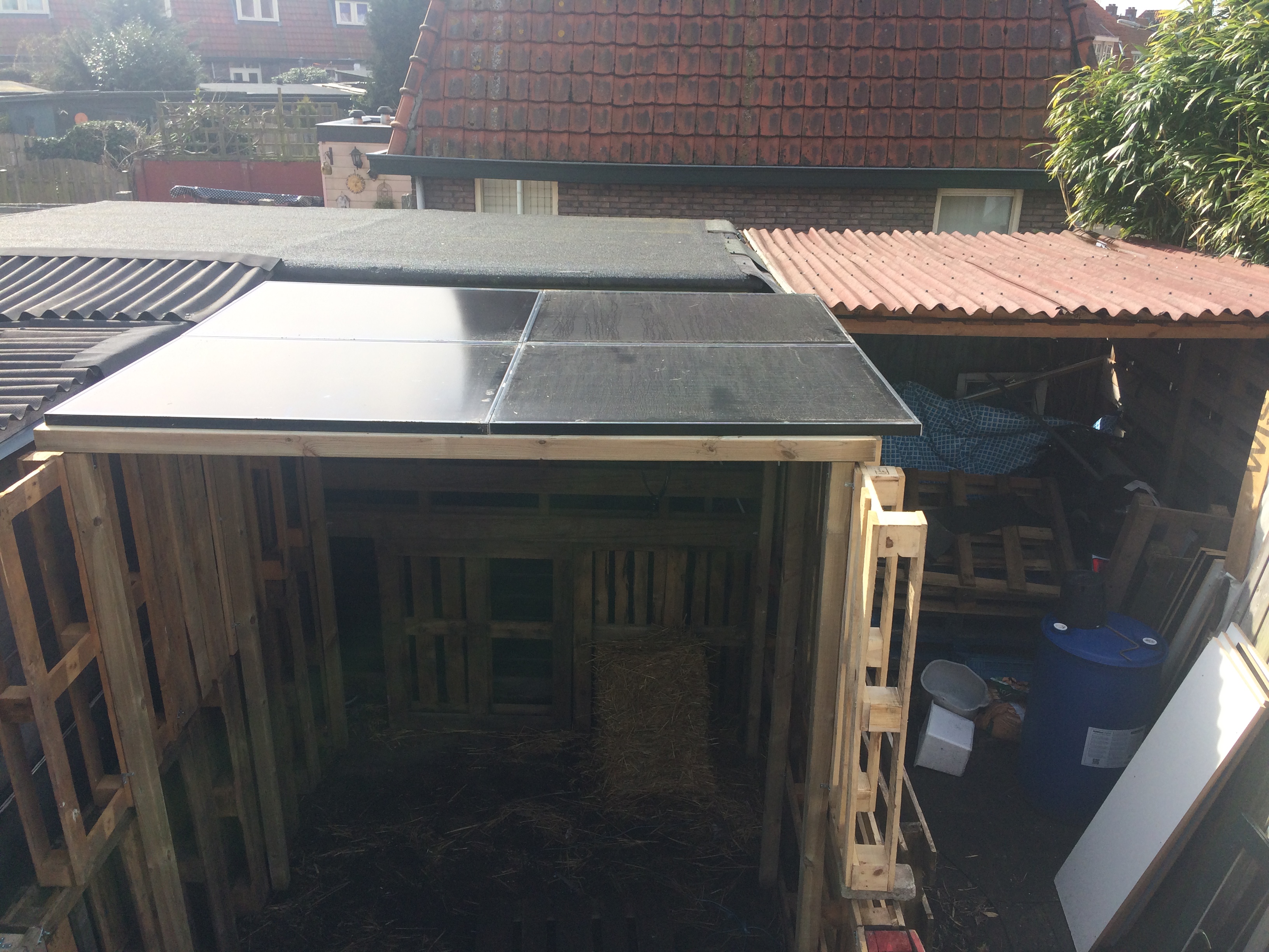 De schuur word gebouwd van oude pallets en tuinhek palen. Het dak word gemaakt van zonnepanelen. De proces besturing word gedaan door een Raspberry Pi.