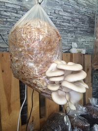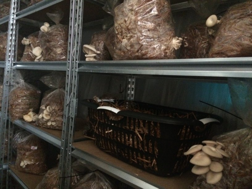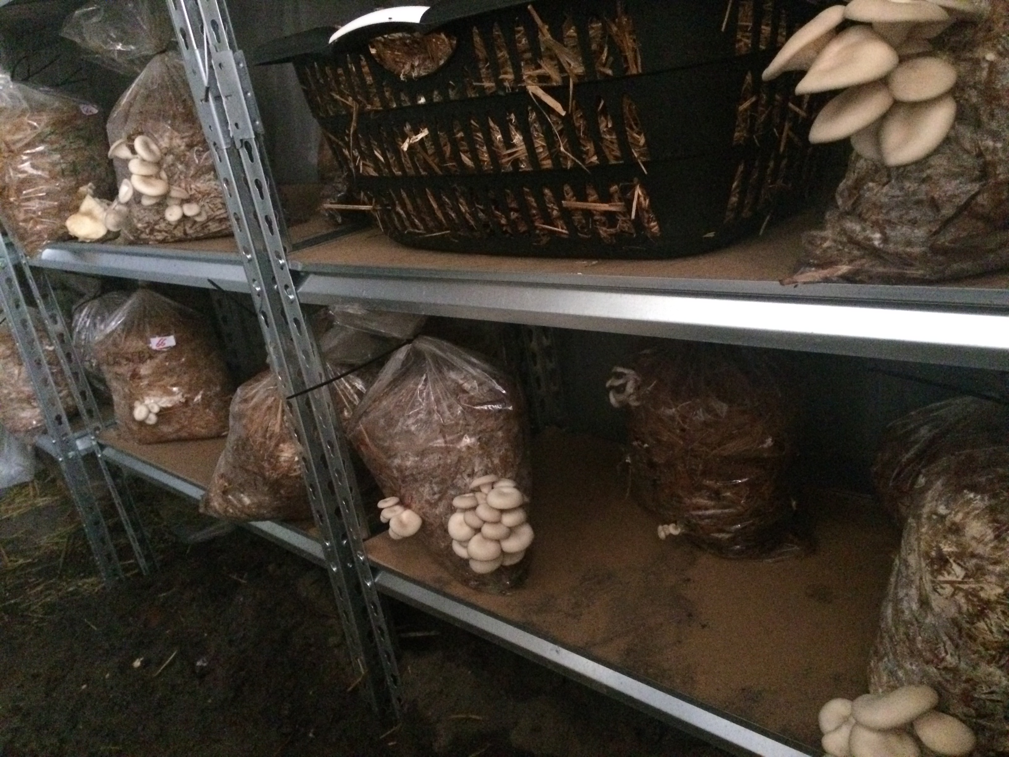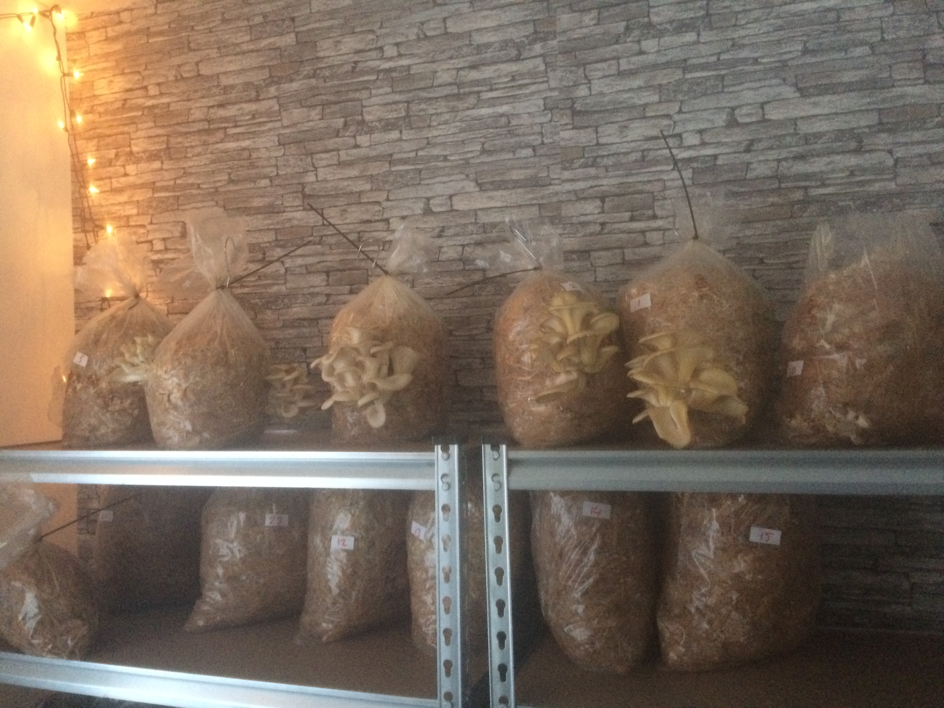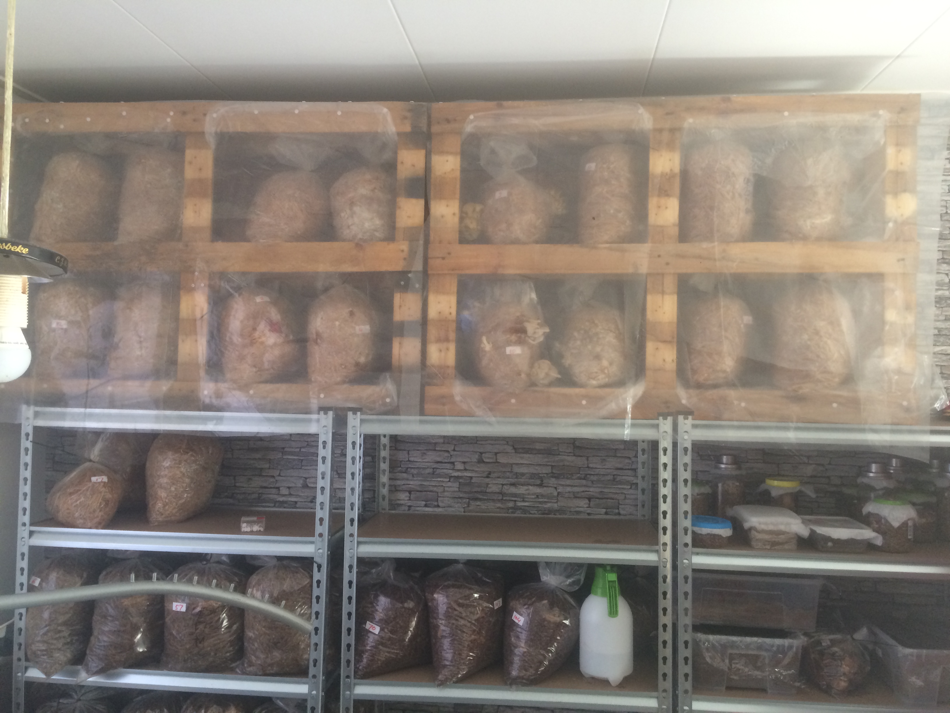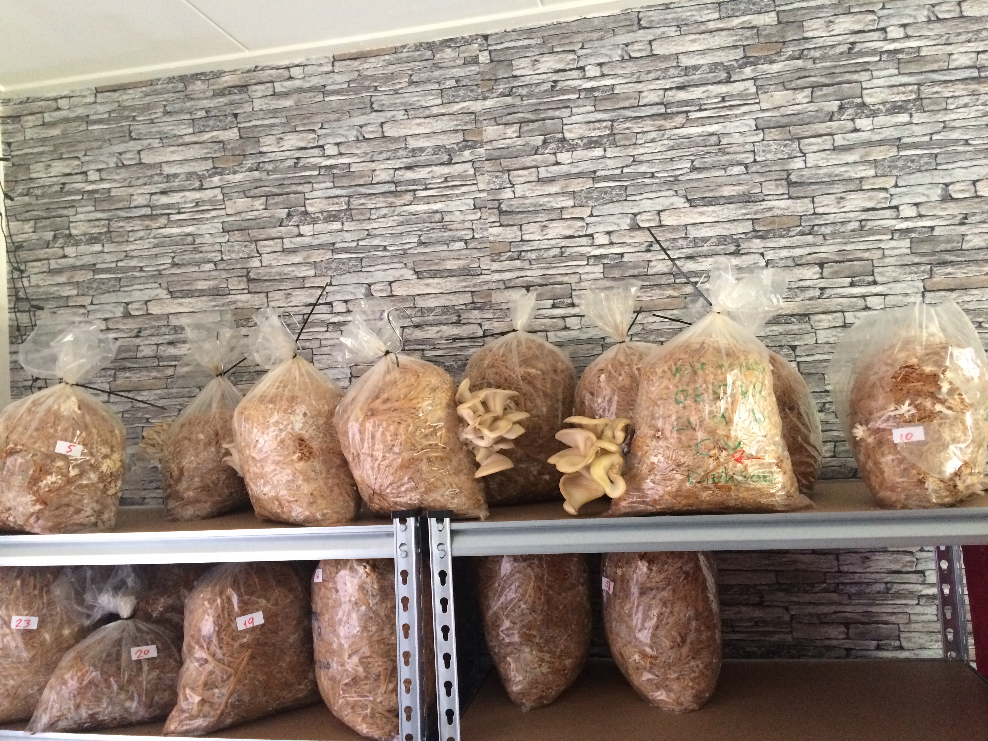 Diverse foto's die met de paddenstoelen kweek hebben te maken.