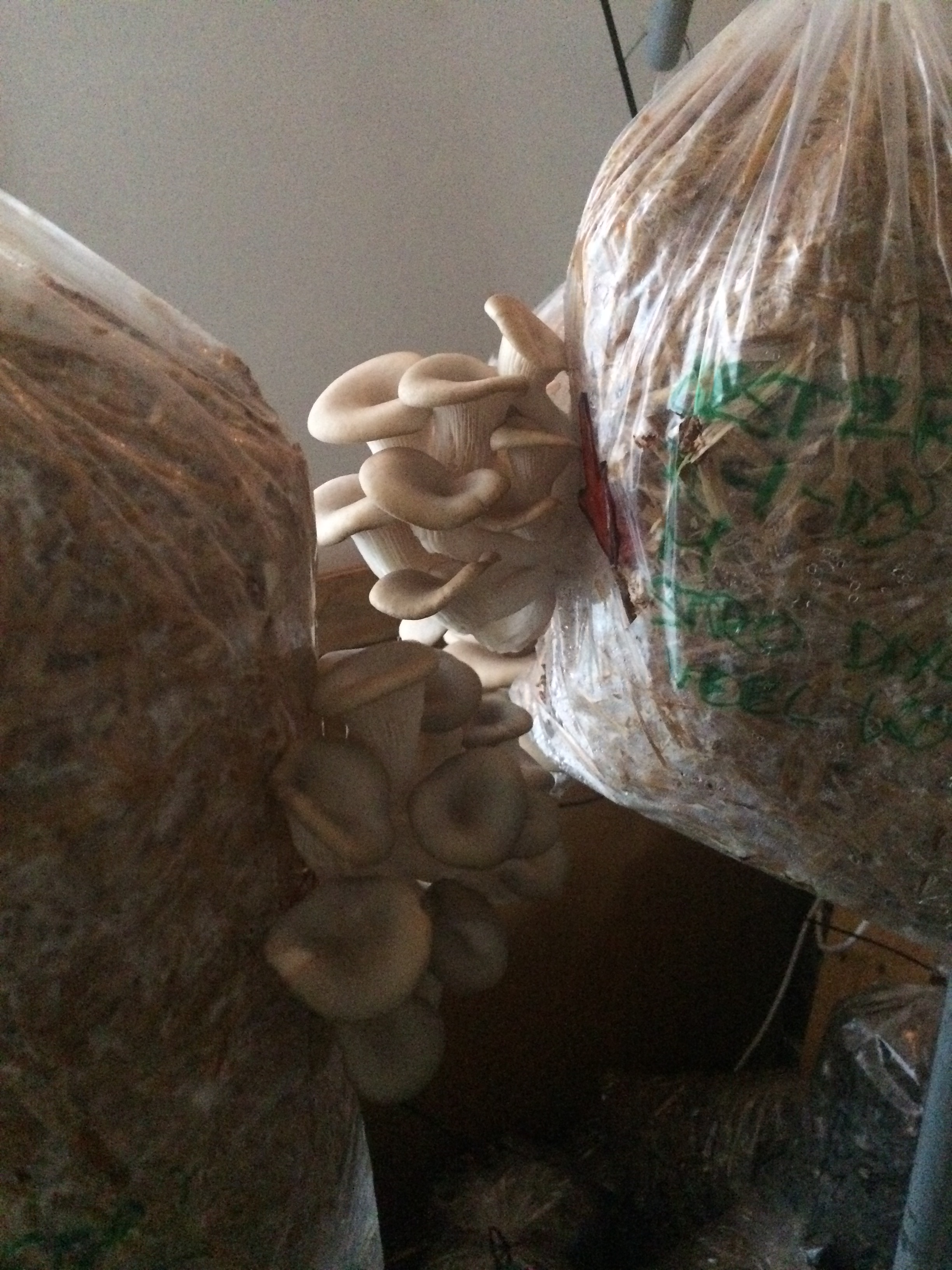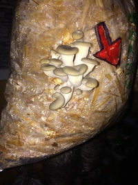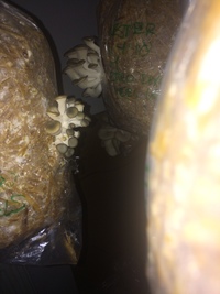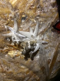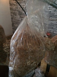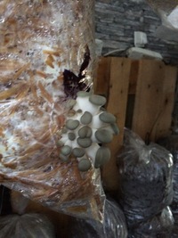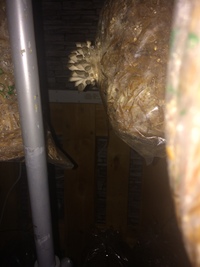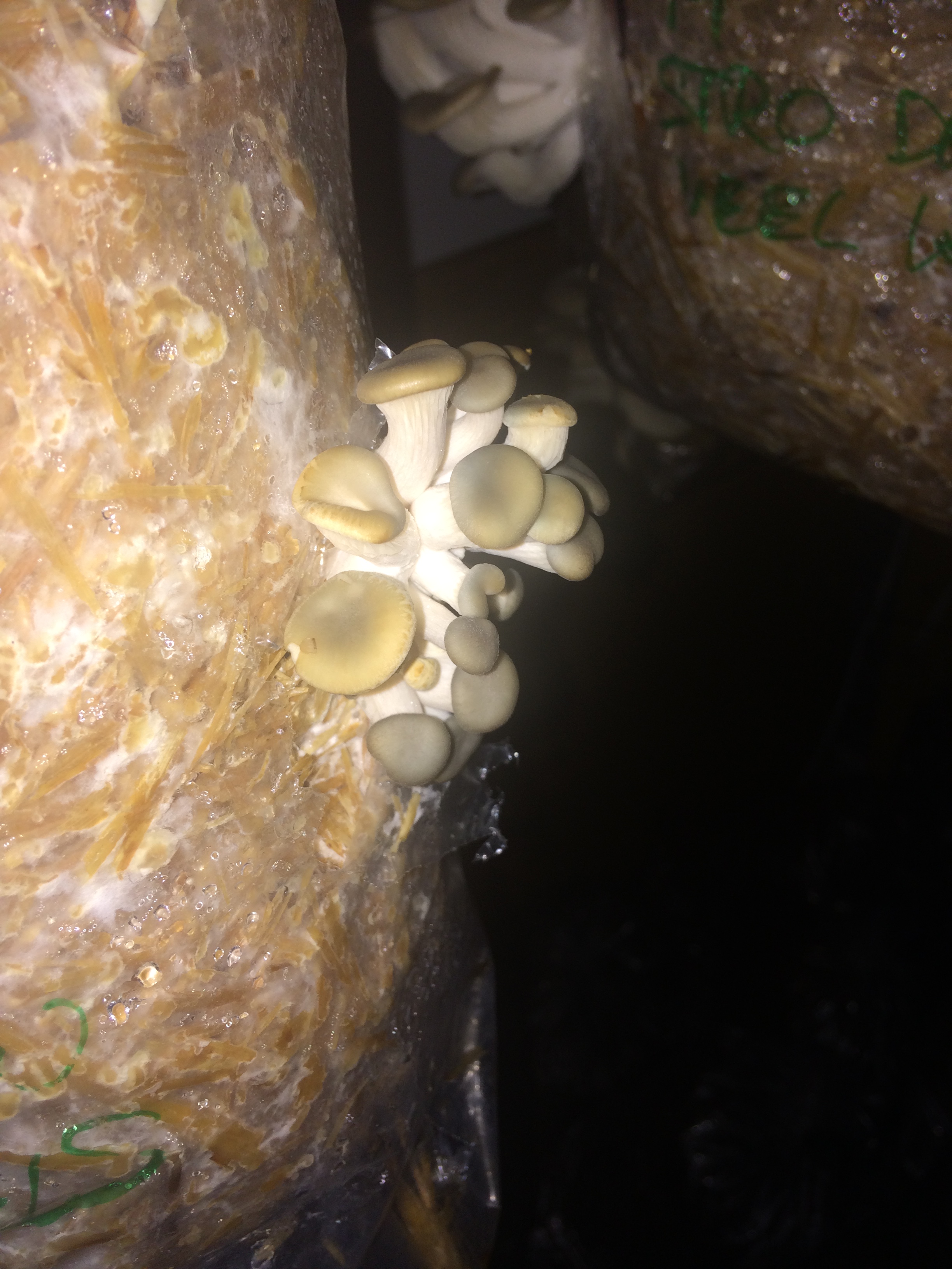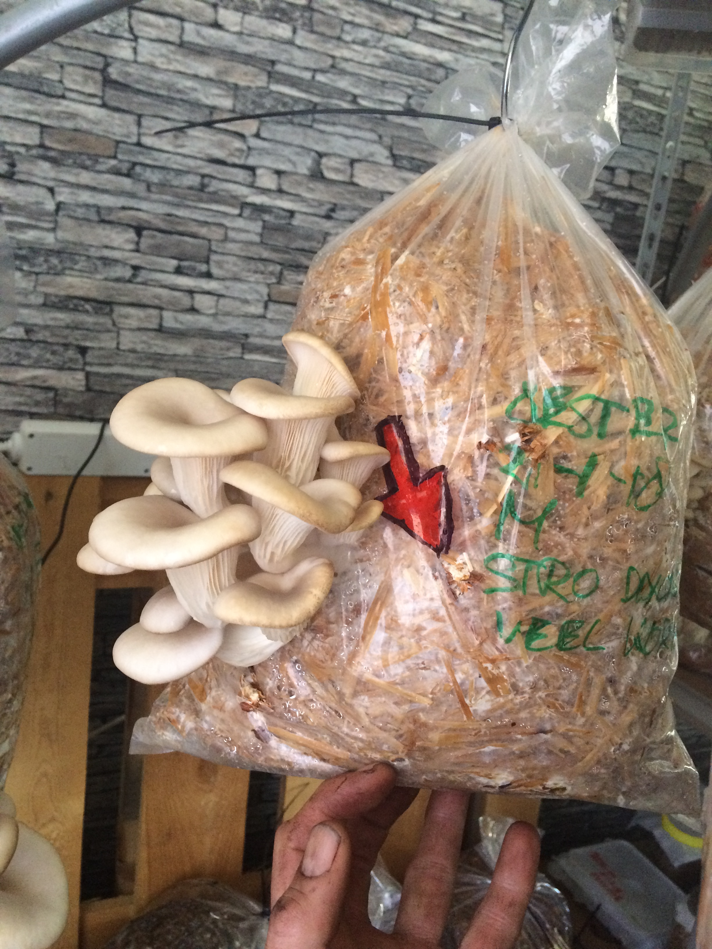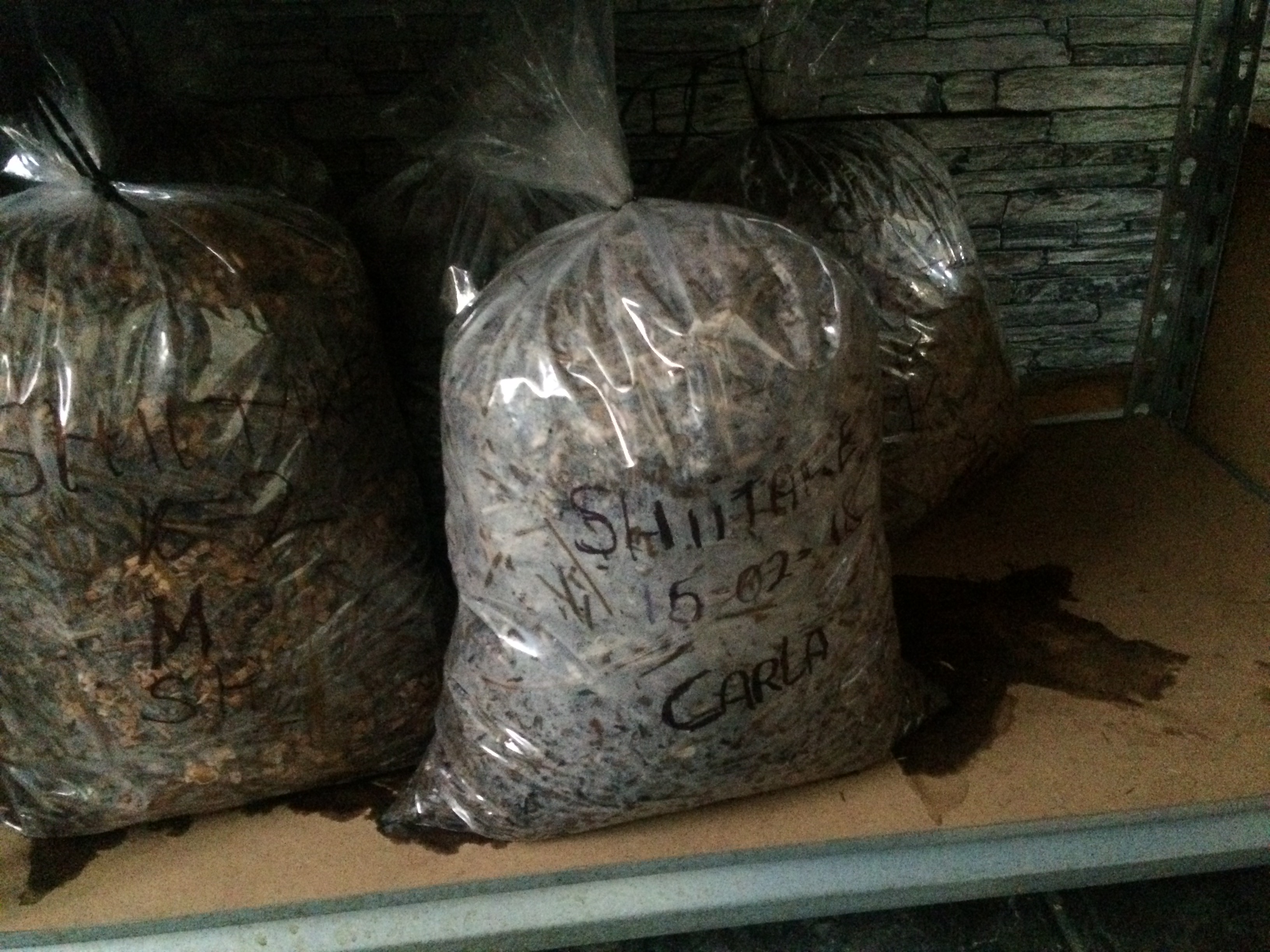 Soms gaat het mis... Balen... 8 zakken Shii Take en 1 zak Oesterzwam met "groentjes". De verkeerde schimmel. Deze zakken kunnen we dus weg gooien