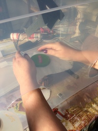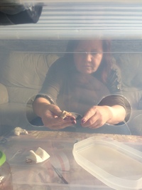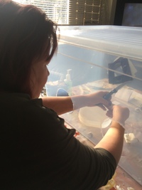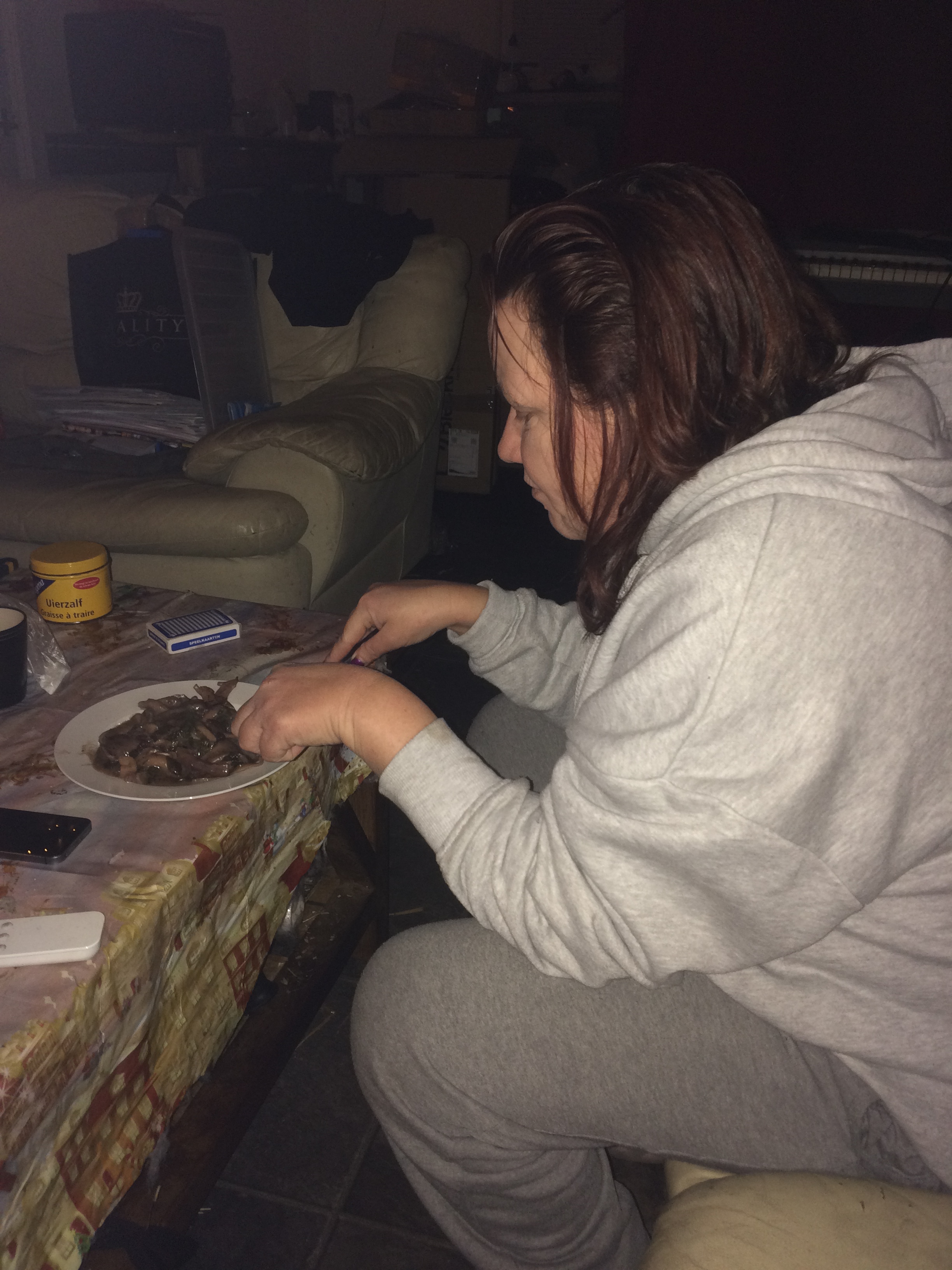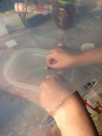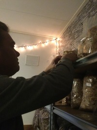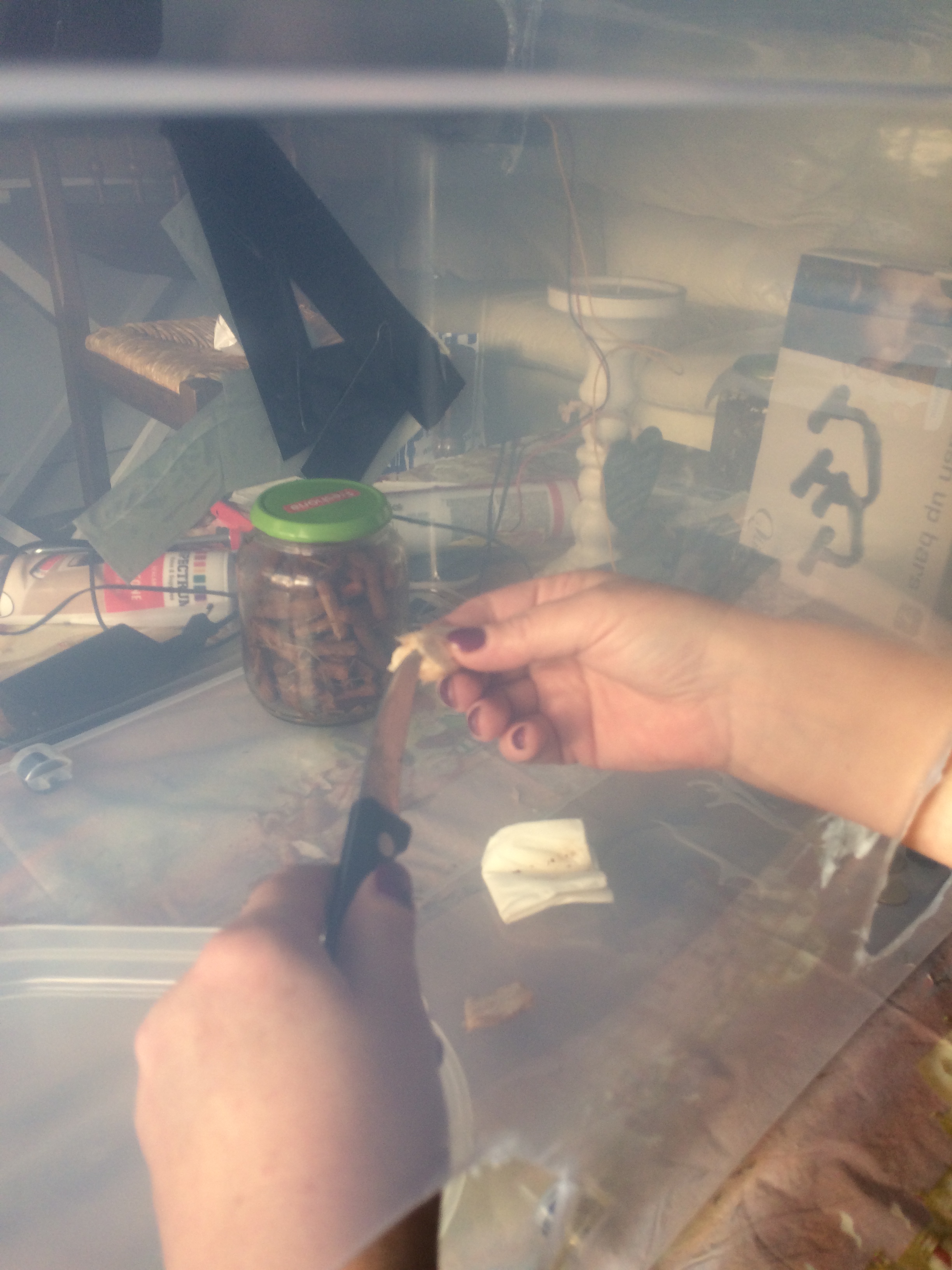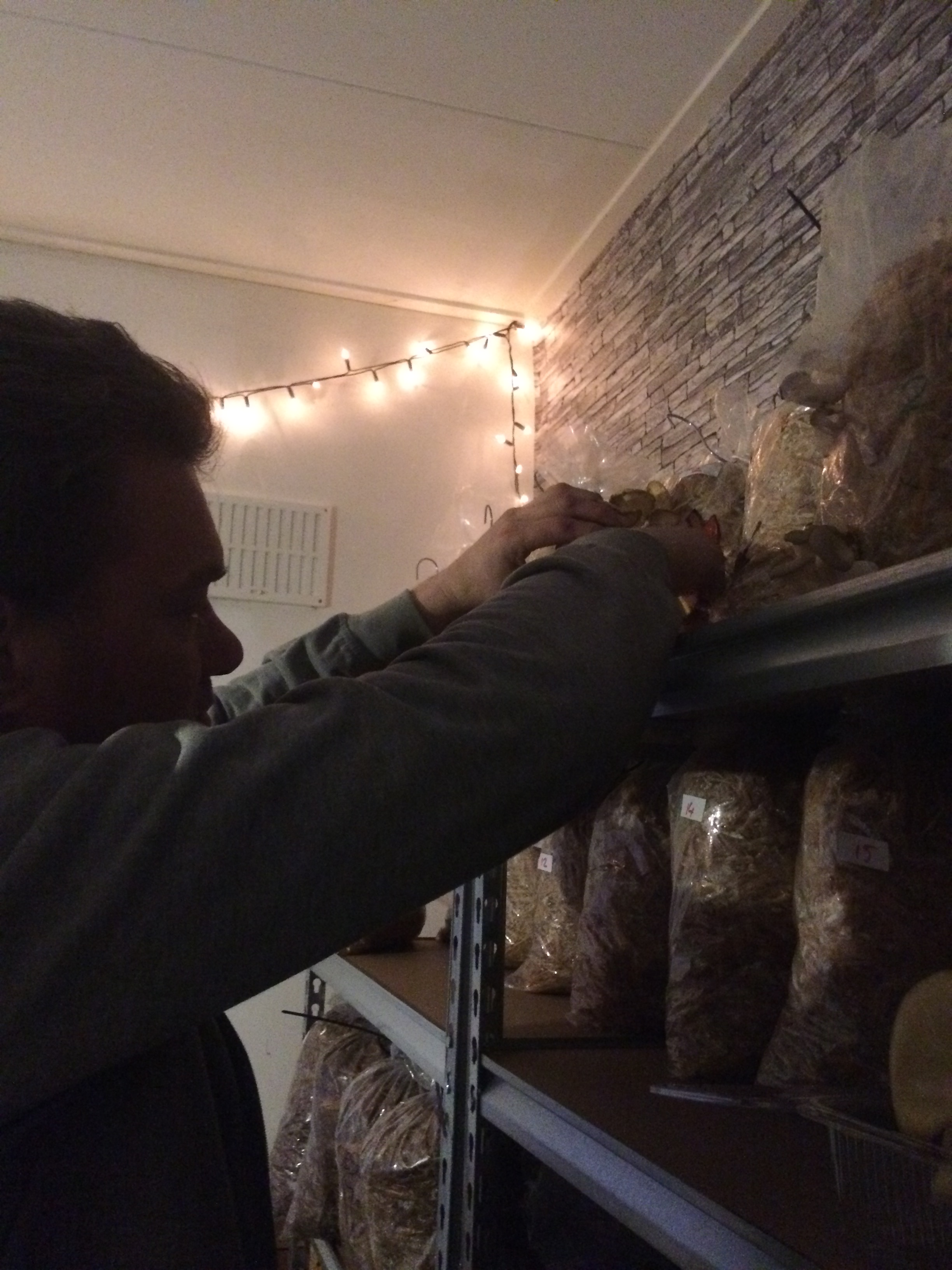 Onze laborante Carla. Ze ent Shii Take paddestoel op hout pluggen.